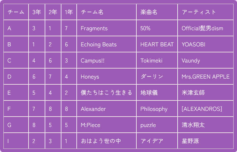 | チーム | 3年 | 2年 | 1年 | チーム名 | 楽曲名 | アーティスト |