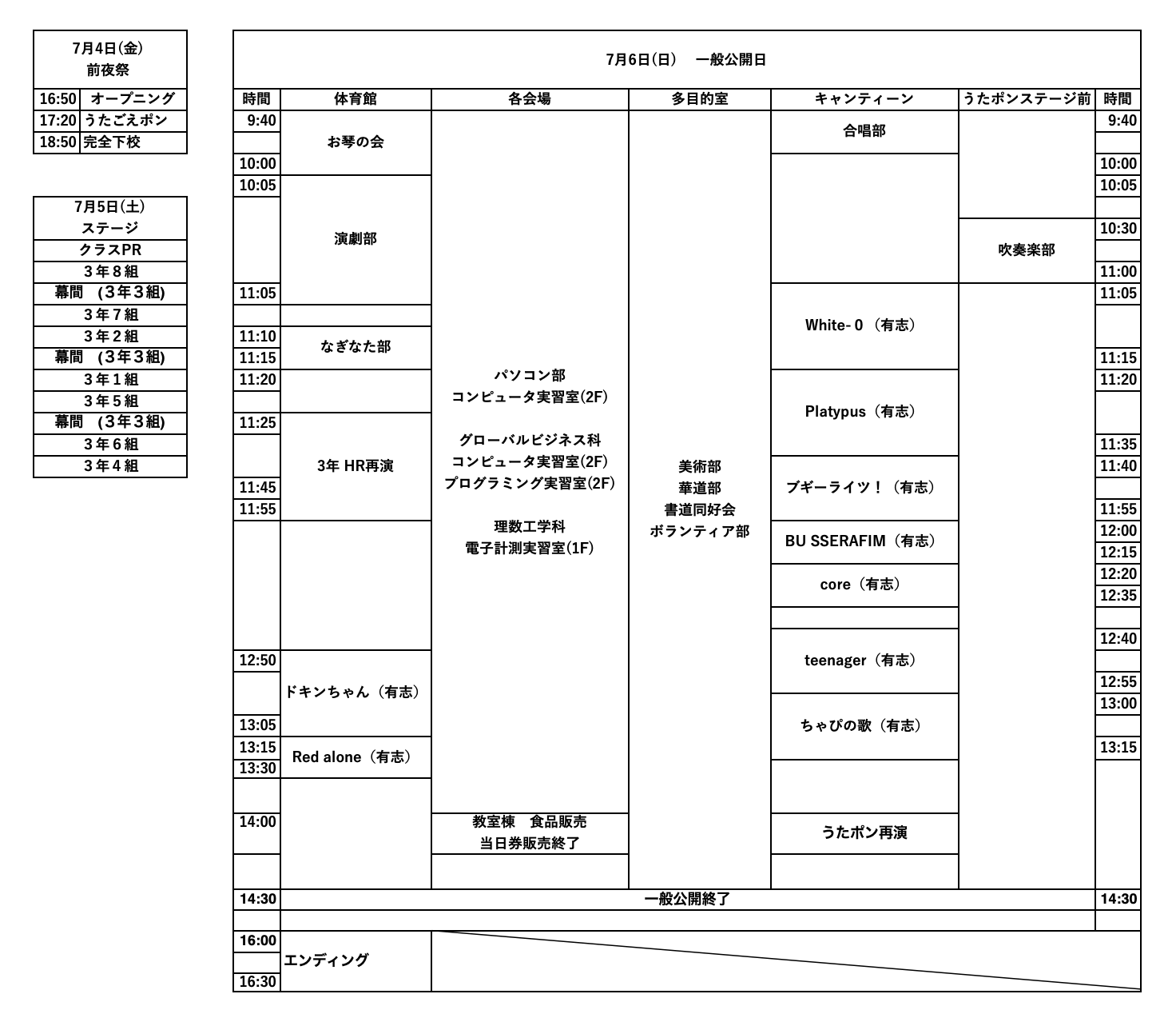 | 時間 | 体育館 | 各会場 | 多目的室 | キャンティーン | うたポンステージ前 | 時間 |